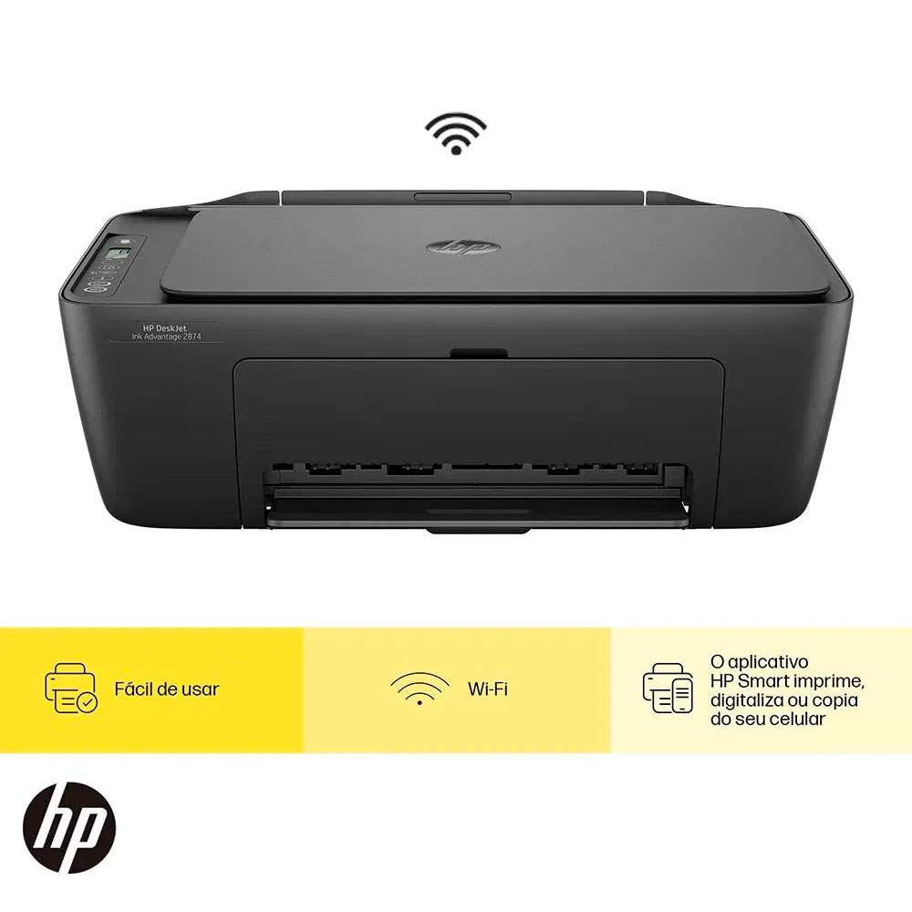 Marca: HP Modelo: 2874 Tipo de Produto: Multifuncional Tipo de impressão: Colorida SKU: 6W7G2A#AK4 Cor do produto: Preto Resolução de Impressão Colorida [DPI] Até 4800 x 1200 dpi otimizados em cores Resolução de Cópia Preto [DPI]: 300 x 300 dpi Ciclo de Trabalho Mensalmente, A4; até 1.000 páginas Número Máximo de Cópias: Até 9 páginas Tipos de Papel Suportados: Tipos de mídia suportados Papel comum, p Visor: Icon LCD display ADF – Alimentador Auto de Documentos: Não Tecnologia de Impressão: HP Thermal Inkjet Conectividade Padrão: 1 porta Wi-Fi 802.11b/g/n; 1 USB 2.0 de Velocidade de Impressão: Preto (ISO): Até 7,5 ppm; Cor (ISO): Até Resolução de Impressão Preto [DPI]: 1200 x 1200 dpi Tamanho de Papel A4 Dimensões sem Embalagem (mm) (Largura X Profundidade X Altura) :425 x 304 x 154 mm; Peso Líquido [kg]: 3,42 Garantia Fabricante: 12 meses